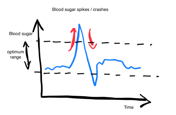 The graph above illustrates how our blood sugar levels can rise after food (or fluids with sugar).